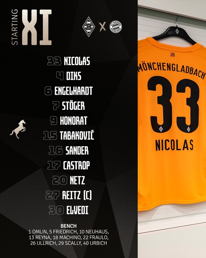 묀헨글라트바흐는 프랑크 오노라, 타바코비치, 케빈 슈퇴거, 필립 샌더, 로코 라이츠, 야닉 엥겔하르트, 카스트로프, 니코 엘베디, 케빈 딕스, 루카 네츠, 골키퍼 모리츠 니콜라스가 선발 출격했다.