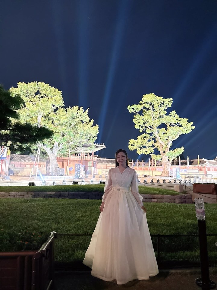 공개된 사진 속 송가인은 은은한 연노랑빛 한복을 차려입고 야경이 빛나는 고궁 앞에 선 모습으로 시선을 사로잡았다.