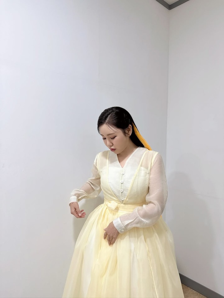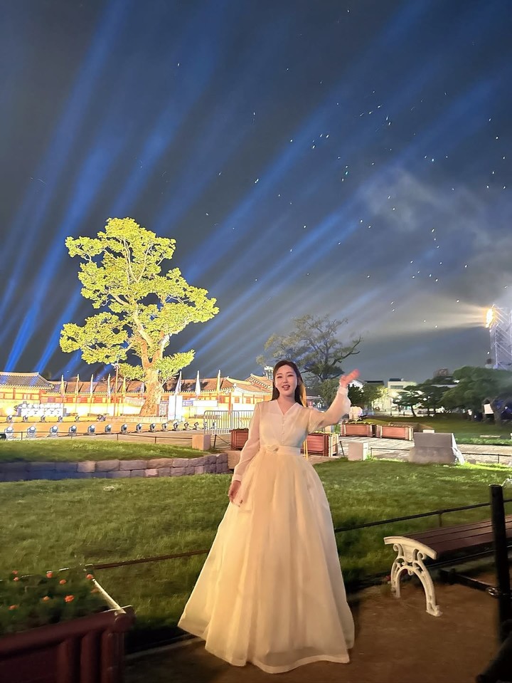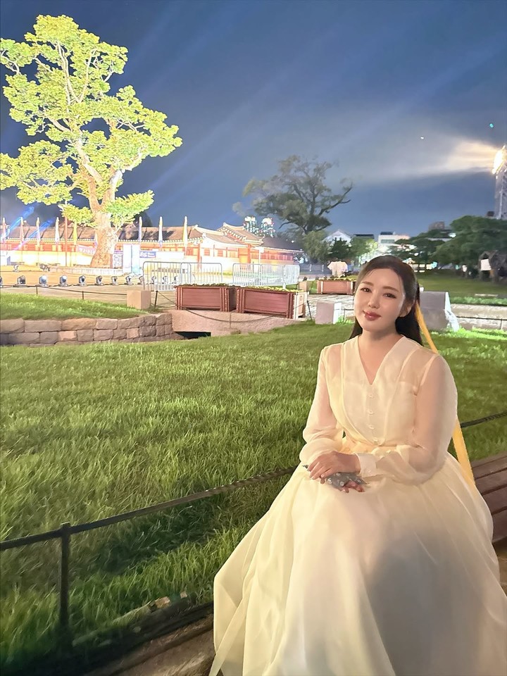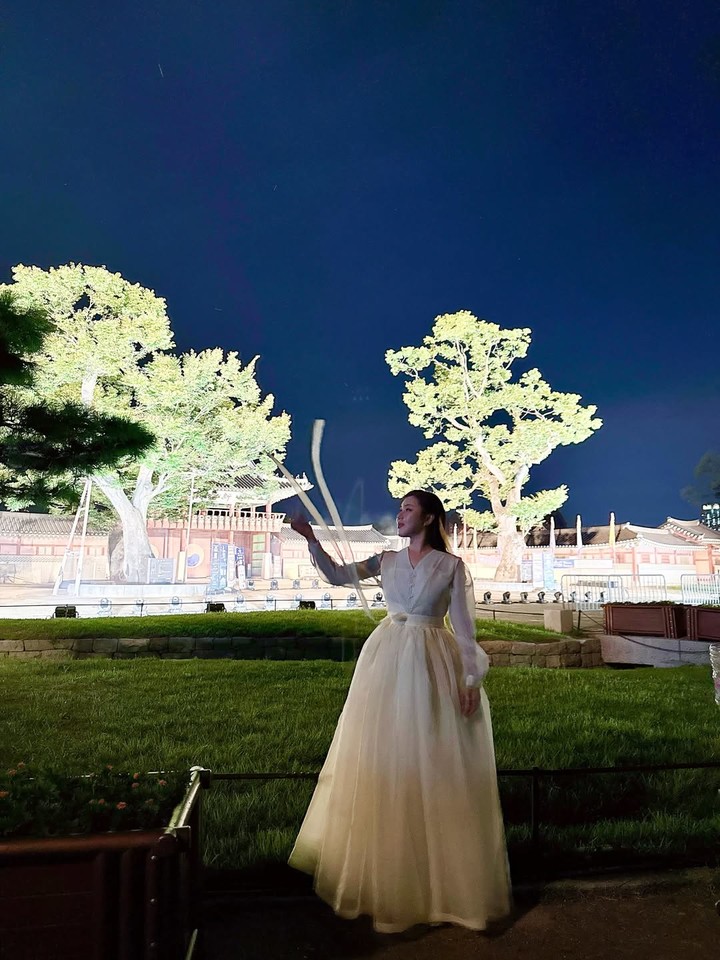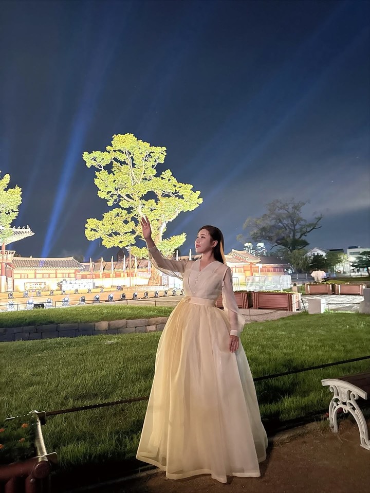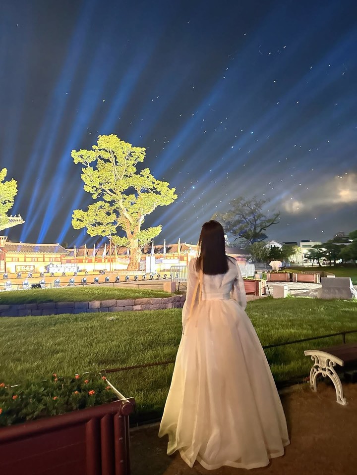 한복 특유의 풍성한 스커트 라인과 투명한 소매 디테일이 조화를 이루며, 마치 사극 속 주인공을 연상케 하는 고혹적인 분위기를 자아냈다.