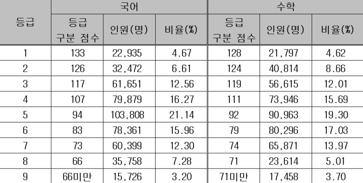 국어의 등급컷은 133-126-117-107-94이며 수학의 등급컷은 128-124-119-111-92이다.