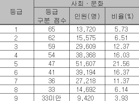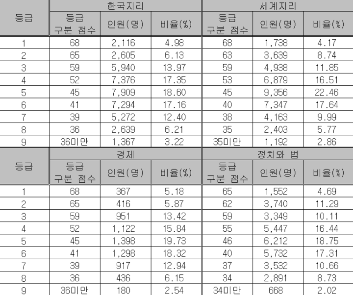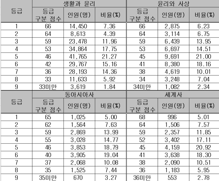 생활과 윤리 66-64-59, 윤리와 사상 66-64-59, 한국지리 68-65-59, 세계지리 68-63-59, 동아시아사 65-62-59, 세계사 68-64-59, 경제 68-65-59, 정치와 법 65-62-59, 사회문화 65-62-59