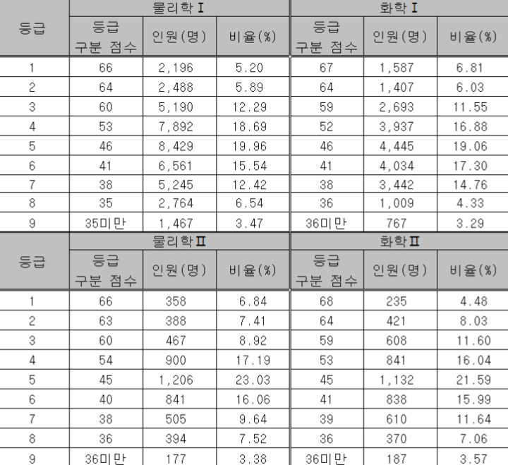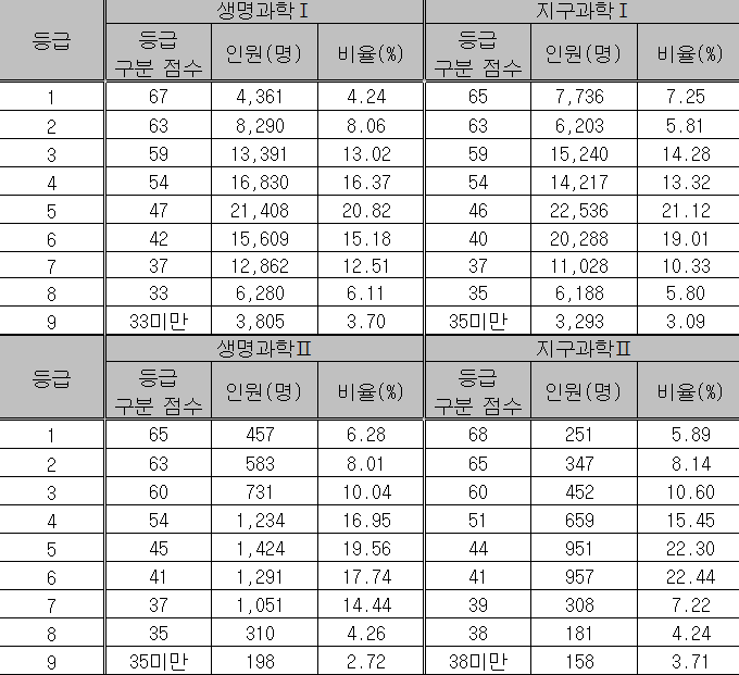 물리학1 66-64-60, 물리학1 66-64-60, 화학1 67-64-59, 생명과학1 67-63-59, 지구과학1 65-63-59, 물리학2 66-63-60, 화학2 68-64-59, 생명과학2 65-63-60, 지구과학2 68-65-60