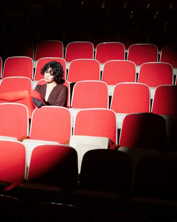 특히 조명이 스치듯 드러난 쇄골과 어깨라인이 스타일의 포인트로 작동하며, 레드 좌석이 깔린 공간과 어우러져 ‘시네마틱’한 분위기를 완성했다.