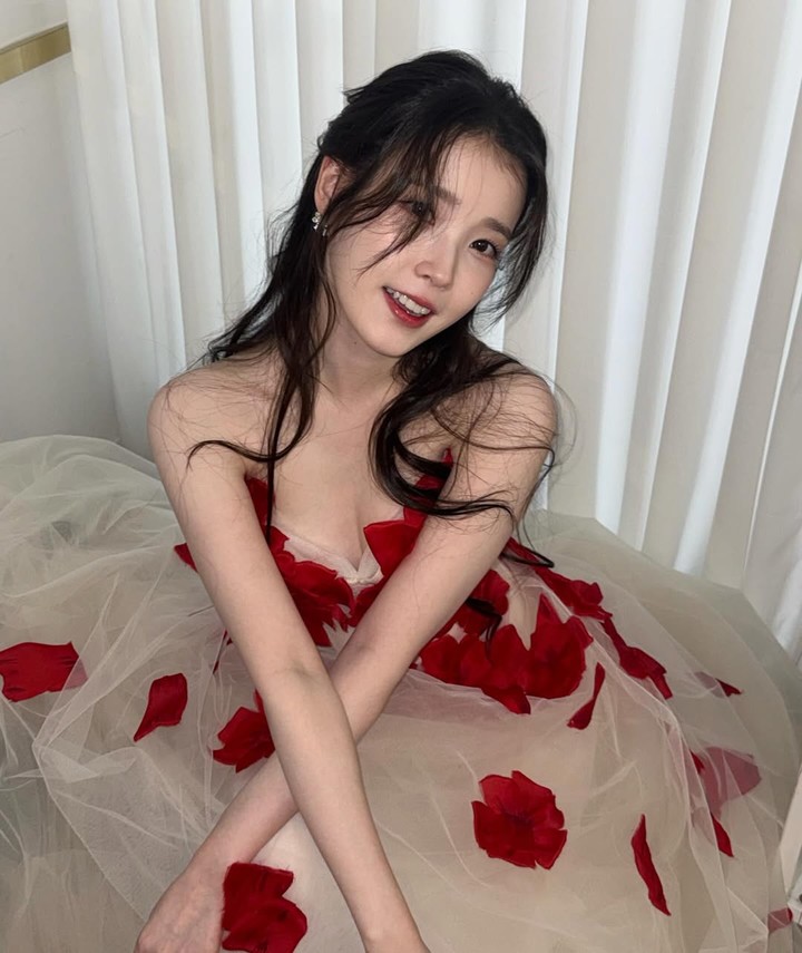 공개된 사진 속 아이유는 흰색 튤 드레스에 레드 꽃잎을 더해 꽃잎이 흩날리는 로맨틱 무드를 연출했다.